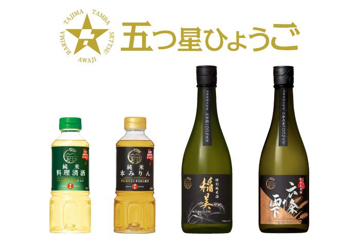『稲美町産シリーズ』である、稲美町で育まれたお米を100%使用した「稲美町産 純米本みりん」、「稲美町産 純米料理清酒」、稲美町産六条大麦を100%使用した焼酎「六条の雫」はいずれも五つ星ひょうごに選定されており、兵庫県の優れた特産品として高く評価されています。